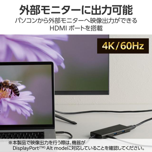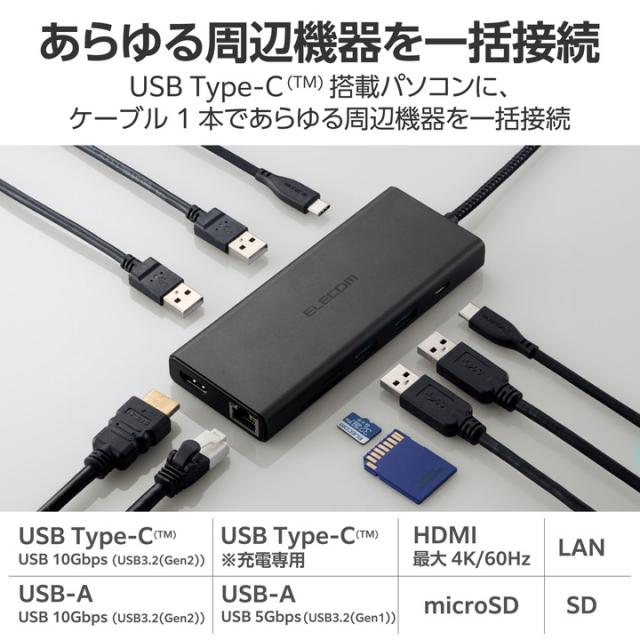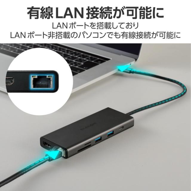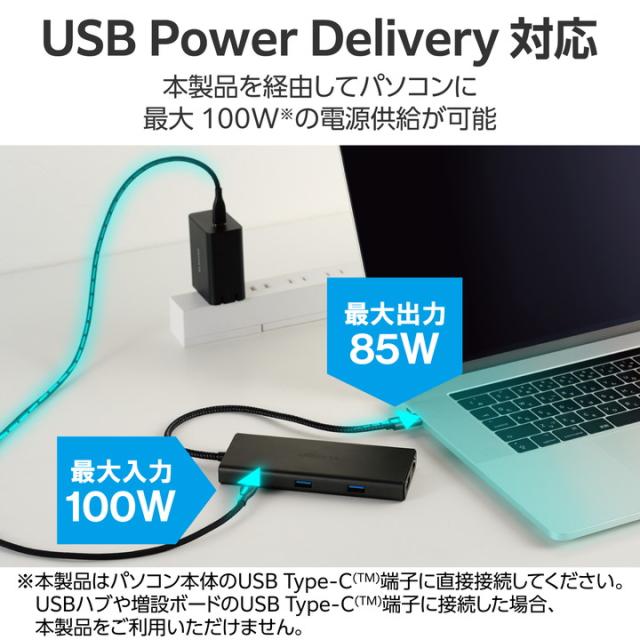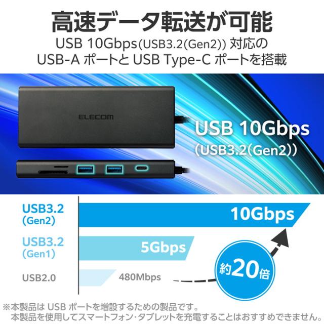 USB 10Gbps(USB3.2(Gen2))対応のUSB Type-C(TM)ポートを搭載したドッキングステーションです。ノートパソコンへ給電できるUSB Power Deliveryに対応し、USB Type-C(TM)コネクター搭載パソコンにケーブル1本であらゆる周辺機器を一括接続できます。![]() ■USB Type-C(TM)コネクターでパソコンに接続し、USB機器やHDMIディスプレイを接続できるドッキングステーションです。 ■USB Type-C(TM)コネクター搭載パソコンにケーブル1本であらゆる周辺機器を一括接続できます。 ■パソコン本体との接続は、最大10Gbps(理論値)の超高速データ転送を実現するUSB 10Gbps(USB3.2(Gen2))に対応しています。 ■USB 10Gbps(USB3.2(Gen2))に対応したUSB Type-C(TM)を1ポート搭載しています。 ■※データ通信専用、映像出力には対応していません。 ■※USB 10Gbps(USB3.2(Gen2))でご使用になるには、お使いのパソコン・デバイスがUSB 10Gbpsに対応している必要があります。 ■USB Power Deliveryに対応したUSB Type-C(TM)ポートを1ポート搭載しています。 ■USB Type-C(TM)コネクターを経由して最大100W(※)の電力をデバイス/パソコン本体に供給するUSB Power Deliveryに対応しています。 ■※製品本体にて15Wを消費しますので、実際の出力は最大85Wとなります。 ■※85Wで給電が必要な場合は、100W出力の充電器をご用意ください。 ■USB Type-C(TM)電源アダプターを接続することで、本製品を経由し、パソコン本体を充電することができます。 ■USB 10Gbps(USB3.2(Gen2))に対応したUSB-Aポートを2ポート搭載しています。 ■USB 5Gbps(USB3.2(Gen1))に対応したUSB-Aポートを2ポート搭載しています。 ■※本製品はUSBポートを増設するための製品です。本製品を使用してスマートフォン・タブレットを充電することはおすすめできません。 ■パソコンから外部モニターへ映像出力ができるHDMIポートを搭載しています。 ■※本製品で映像出力を行う際は、機器がDisplayPort(TM) Alt modeに対応していることを確認してください。 ■パソコンを有線ネットワーク接続できるLANポートを搭載しています。 ■SDXC/SDHCに対応した、SDカードスロットとmicroSDカードスロットを搭載しています。 ■USB Type-C(TM)コネクターは、表と裏がなく、向きを気にせず挿し込み可能です。 ■※USB Type-C(TM)コネクターを標準搭載するパソコンでのみ使用可能です。 ■放熱性と耐ノイズ性に優れ、高級感のあるアルミ筺体を使用しています。 ■ケーブルは紛失の心配がない直付けタイプです。ケーブルの長さは約25.5cmです。 ■※USB Type-C(TM)コネクターからの充電に対応しない本体の場合、本製品のUSB Type-C(TM)コネクター経由での本体充電はできません。充電を行う際は、機器がUSB Power Deliveryに対応していることを確認してください。 ■※本製品はOS起動前のシステム画面やBIOS画面では動作しません。 ■※本製品はパソコン本体のUSB Type-C(TM)コネクターに直接接続してください。USBハブや増設ボードのUSB Type-C(TM)コネクターに接続した場合、本製品をご利用いただけません。 ■※USB Type-C and USB-C are trademarks of USB Implementers Forum ■自社環境認定基準を1つ以上満たし、『THINK ECOLOGY』マークを表示した製品です。 ■廃棄物削減に取り組み、製品に同梱する取扱説明書などをペーパーレス化した製品です。 ■環境保全に取り組み、製品の包装容器におけるプラスチック重量を、社内基準製品より20%以上削減した製品です。 ■環境保全に取り組み、製品の包装容器が紙・ダンボール・ポリ袋のみで構成されている製品です。 ![]() ■対応OS(Windows):Windows 11/Windows 10 ■対応OS(macOS):macOS Sonoma 14/macOS Ventura 13/macOS Monterey 12 ■対応OS(iPadOS):iPadOS 17/iPadOS 16 ■対応OS 備考:※各OSの最新バージョンへのアップデートや、サービスパックのインストールが必要になる場合があります。 ■対応機種:iPad/iPad Air/Macbook/Macbook Pro ■コネクター仕様(アップストリーム):USB Type-C(TM)コネクター<USB 10Gbps(USB3.2(Gen2))>、USB Power Delivery対応(最大入力100W / 最大出力85W)、DisplayPort(TM) Alt mode (USB2.0接続時は、USB2.0互換で動作(USB2.0時は、映像出力非対応)) ■USBポート(ダウンストリーム):1:USB Type-C(TM)ポート<USB 10Gbps(USB3.2(Gen2))>×1 ※データ通信専用、映像出力には対応していません。 ■USBポート(ダウンストリーム):2:USB Type-C(TM)ポート×1<最大出力85W> ※充電専用USB Power Deliveryポート ■USBポート(ダウンストリーム):3:USB-Aポート<USB 10Gbps(USB3.2(Gen2))>×2、供給電力値:2ポート合計:15.2W(5V/3.04A) ■USBポート(ダウンストリーム):4:USB-Aポート<USB 5Gbps(USB3.2(Gen1))>×2、供給電力値:2ポート合計 :15.2W(5V/3.04A) ■USBポート(ダウンストリーム):※本製品はUSBポートを増設するための製品です。本製品を使用してスマートフォン・タブレットを充電することはおすすめできません。 ■映像出力ポート(ダウンストリーム):HDMI×1<対応解像度:最大4K/60Hz> ■LANポート(ダウンストリーム):RJ-45(1000BASE-T/100BASE-TX/10BASE-T) ■カードリーダー(ダウンストリーム):1:SDメモリーカード、対応メディア:SD(HighSpeed/ProHighSpeed/Class2/4/6/10)、SDHC(Class2/4/6/10/UHS-I)、SDXC(Class10/UHS-I) ■カードリーダー(ダウンストリ