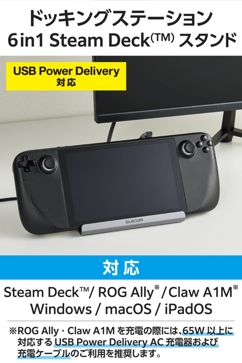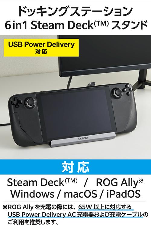 Steam Deck(TM)などポータブルゲーム機器に対応したスタンド型ドッキングステーションです。HDMI(R)ポート搭載で、ポータブルゲーム機器をテレビやモニターに接続して大きな画面で楽しめます。またUSB Power Deliveryに対応しておりゲーム中も給電に困りません。