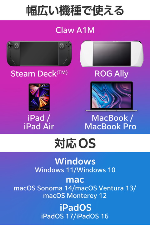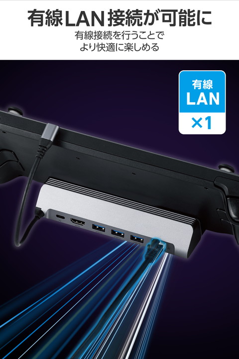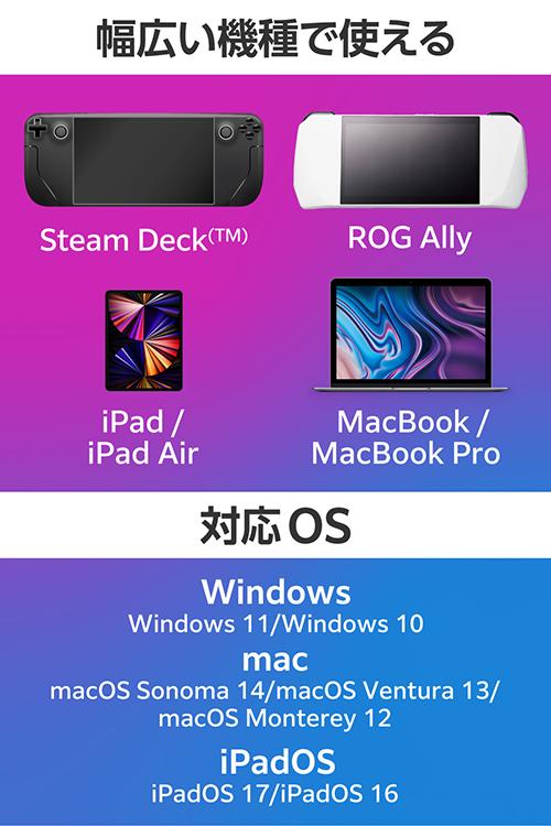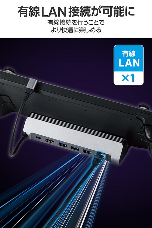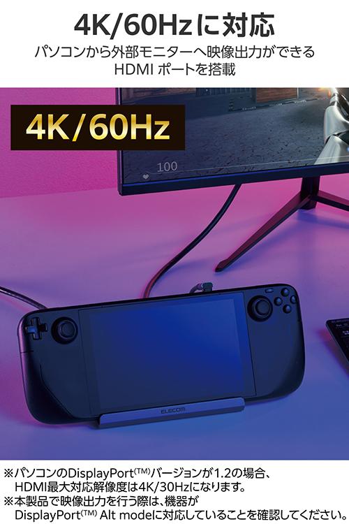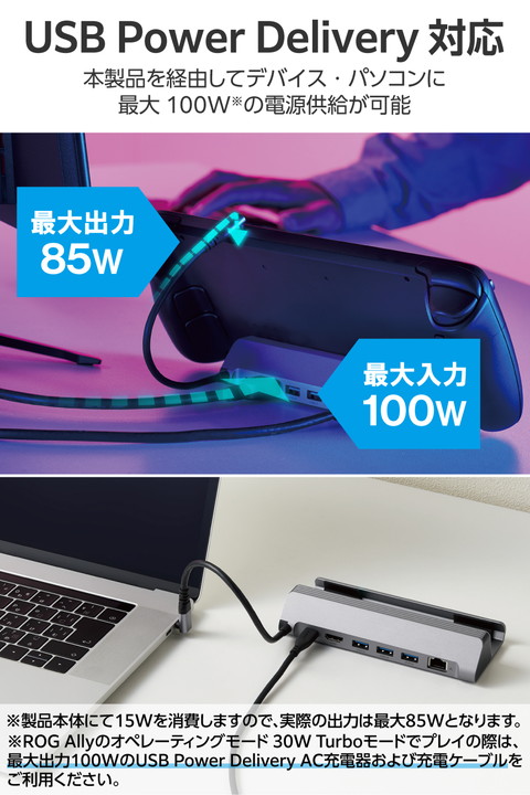 Steam Deck(TM)などポータブルゲーム機器に対応したスタンド型ドッキングステーションです。HDMI(R)ポート搭載で、ポータブルゲーム機器をテレビやモニターに接続して大きな画面で楽しめます。またUSB Power Deliveryに対応しておりゲーム中も給電に困りません。![]() ■Steam Deck(TM)などポータブルゲーム機器に対応したスタンド型ドッキングステーションです。HDMIポート搭載で、ポータブルゲーム機器をテレビやモニターに接続して大きな画面で楽しめます。またUSB Power Deliveryに対応しているのでゲーム中も給電に困りません。 ■USB Type-C(TM)コネクターでパソコンに接続し、USB機器やHDMIディスプレイを接続できるドッキングステーションです。 ■USB Type-C(TM)コネクター搭載パソコンにケーブル1本で必要な周辺機器を一括接続できます。 ■パソコン本体との接続は、最大5Gbps(理論値)の超高速データ転送を実現するUSB 5Gbps(USB3.2(Gen1))に対応しています。 ■※USB 5Gbps(USB3.2(Gen1))でご使用になるには、お使いのパソコン・デバイスがUSB 5Gbpsに対応している必要があります。 ■USB Power Deliveryに対応したUSB Type-C(TM)ポートを1ポート搭載しています。 ■USB Type-C(TM)コネクターを経由して最大100W(※)の電力をデバイス/パソコン本体に供給するUSB Power Deliveryに対応しています。 ■※製品本体にて15Wを消費しますので、実際の出力は最大85Wとなります。 ■※85Wで給電が必要な場合は、100W出力の充電器をご用意ください。 ■USB Type-C(TM)電源アダプターを接続することで、本製品を経由し、パソコン本体を充電することができます。 ■USB 5Gbps(USB3.2(Gen1))に対応したUSB-Aポートを3ポート搭載しています。 ■パソコンから外部モニターへ映像出力ができるHDMIポートを搭載しています。 ■※パソコンのDisplayPort(TM)バージョンが1.2の場合、HDMI最大対応解像度は4K/30Hzになります。 ■※パソコンのDisplayPort(TM)バージョンが1.4の場合、HDMI最大対応解像度は4K/60Hzになります。 ■※本製品で映像出力を行う際は、機器がDisplayPort(TM) Alt modeに対応していることを確認してください。 ■パソコンを有線ネットワーク接続できるLANポートを搭載しています。 ■USB Type-C(TM)コネクターは、表と裏がなく、向きを気にせず挿し込み可能です。 ■※USB Type-C(TM)コネクターを標準搭載するパソコンでのみ使用可能です。 ■放熱性と耐ノイズ性に優れ、高級感のあるアルミ筺体を使用しています。 ■ケーブルは紛失の心配がない直付けタイプです。ケーブルの長さは約16cmです。 ■※USB Type-C(TM)コネクターからの充電に対応しない本体の場合、本製品のUSB Type-C(TM)コネクター経由での本体充電はできません。充電を行う際は、機器がUSB Power Deliveryに対応していることを確認してください。 ■※本製品はOS起動前のシステム画面やBIOS画面では動作しません。 ■※本製品はパソコン本体のUSB Type-C(TM)コネクターに直接接続してください。USBハブや増設ボードのUSB Type-C(TM)コネクターに接続した場合、本製品をご利用いただけません。 ■※ROG Allyを充電する場合、65W以上に対応するUSB Power Delivery AC充電器および充電ケーブルのご利用を推奨します。 オペレーティングモード 30W Turboモードでプレイの際は、最大出力100WのUSB Power Delivery AC充電器および充電ケーブルをご利用ください。 ■※USB Type-C and USB-C are trademarks of USB Implementers Forum ■※Claw A1Mを充電する場合、65W以上に対応するUSB Power Delivery AC充電器および充電ケーブルのご利用を推奨します。 ■自社環境認定基準を1つ以上満たし、『THINK ECOLOGY』マークを表示した製品です。 ■廃棄物削減に取り組み、製品に同梱する取扱説明書などをペーパーレス化した製品です。 ■環境保全に取り組み、製品の包装容器におけるプラスチック重量を、社内基準製品より20%以上削減した製品です。 ■環境保全に取り組み、製品の包装容器が紙・ダンボール・ポリ袋のみで構成されている製品です。 ![]() ■対応OS(Windows):Windows 11/Windows 10 ■対応OS(macOS):macOS Sonoma 14/macOS Ventura 13/macOS Monterey 12 ■対応OS(iPadOS):iPadOS 17/iPadOS 16 ■対応OS 備考:※各OSの最新バージョンへのアップデートや、サービスパックのインストールが必要になる場合があります。 ■対応機種:ROG Ally/Steam Deck(TM) /Claw A1M/iPad/iPad Air/MacBook/MacBook Pro ■コネクター仕様(アップストリーム):USB Type-C(TM)コネクター<USB 5Gbps(USB3.2(Gen1))>、USB Power Delivery対応(最大入力100W / 最大出力85W)、DisplayPort(TM) Alt mode (USB2.0接続時は、USB2.0互換で動作(USB2.0時は、映像出力非対応)) ■USBポート(ダウンストリーム):1:USB Type-C(TM)ポート×1<最大出力85W> ※充電専用USB Power Deliveryポート ■USBポート(ダウンストリーム):2:USB-Aポート<USB 5Gbps(USB3.2(Gen1))>×3、供給電力値:3ポート合計 13.5W(5V/2.7A) ■映像出力ポート(ダウンストリーム):HDMI×1<対応解像度:最大4K/60Hz> ■映像出力ポート(ダウンストリーム):※パソコンのDisplayPort(TM)が1.2の場合、HDMI最大対応解像度は4K/30Hzになります。 ■映像出力ポート(ダウンストリーム):※パソコンのDisplayPort(TM)が1.4の場合、HDMI最大