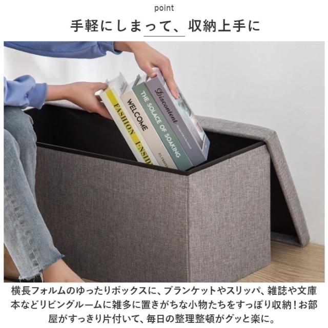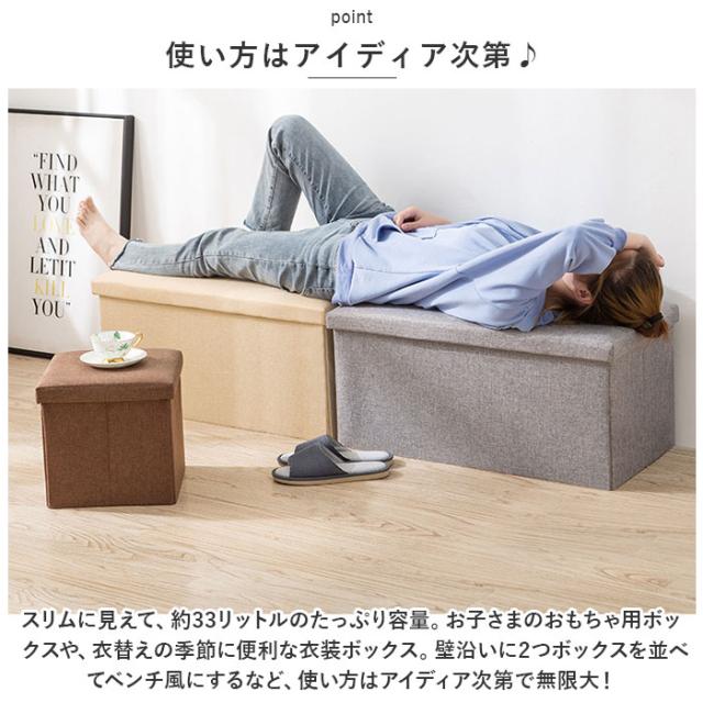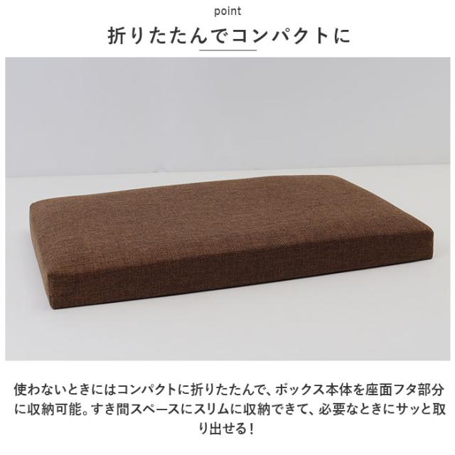 | 商品説明 | ・たっぷり収納できて、ひと休みしたい時にはちょこんと腰掛けに♪座ってしまえてとっても便利「スツールにもなる収納ボックス」(48cm×30cm×30cm)が新登場! 【手軽にしまって、収納上手に】 ・横長フォルムのゆったりボックスに、ブランケットやスリッパ、雑誌や文庫本などリビングルームに雑多に置きがちな小物たちをすっぽり収納!お部屋がすっきり片付いて、毎日の整理整頓がグッと楽に。 【座り心地抜群のスツールに】 ・ゆっくりと沈みこむ、ふかふかクッション入りのフタを被せると、ちょこんと座れるスツールに変身!お掃除など家事の合間にふわっと腰かければ、ほんの束の間リラックス♪ 【パパさんが座っても大丈夫】 ・座面クッション下とボックス側面は丈夫なMDF合板で仕上げた、耐荷重150kgの安心構造。リビングでくつろぎたいパパさんが腰掛けても大丈夫♪(※腰掛けて使用する際の耐荷重です。耐荷重に注意してご使用ください。) 【アレンジ自在の3WAYスタイル】 ・収納ボックスやスツールとしてはもちろん、ソファの近くに置いて、疲れた足を休ませるオットマンやサイドテーブルとしても大活躍。 【シートクッションにしてもOK!】 ・折りたたんだ状態でフローリングにさりげなく置いておけば、シートクッションとしても大活躍!スポンジクッションがお尻の重みをやさしく受け止めて、座布団よりも気持ちいい♪ 【使い方はアイディア次第♪】 ・スリムに見えて、約33リットルのたっぷり容量。お子さまのおもちゃ用ボックスや、衣替えの季節に便利な衣装ボックス。壁沿いに2つボックスを並べてベンチ風にするなど、使い方はアイディア次第で無限大! 【折りたたんでコンパクトに】 ・使わないときにはコンパクトに折りたたんで、ボックス本体を座面フタ部分に収納可能。すき間スペースにスリムに収納できて、必要なときにサッと取り出せる! 【空間デザインを愉しむ】 ・収納ボックス表面は、オールシーズン快適に使えるコットンリネン仕上げ。色違いのボックスを並べておくだけでお部屋を華やかに演出する、ナチュラル&ビビッドカラーのバリエーション。 |