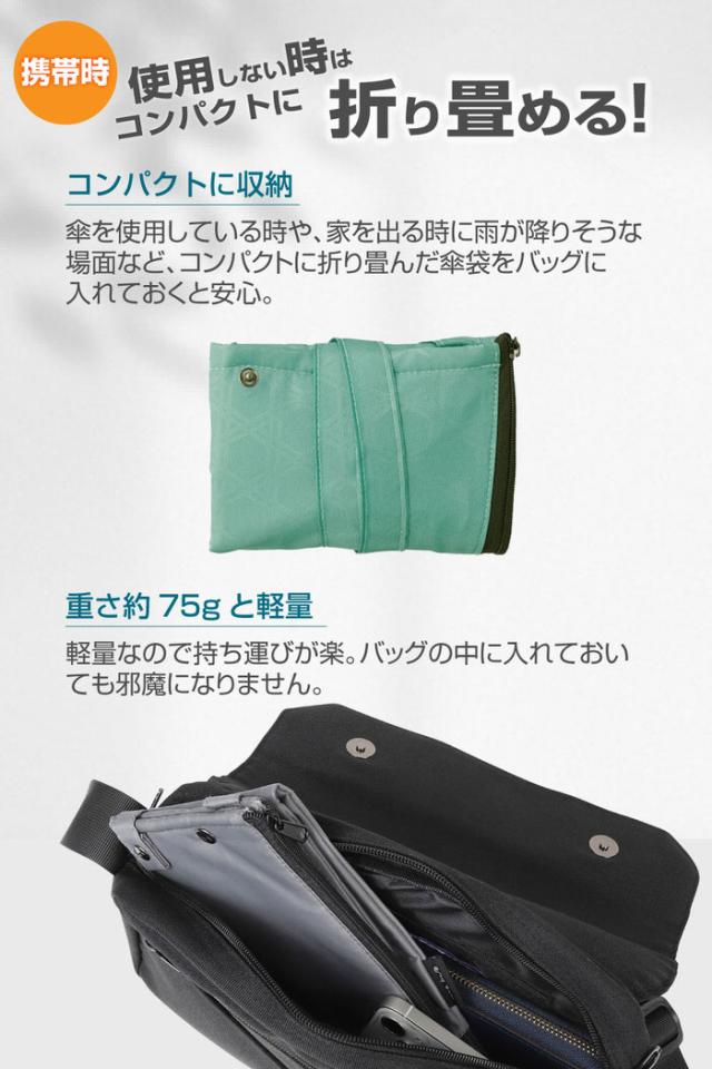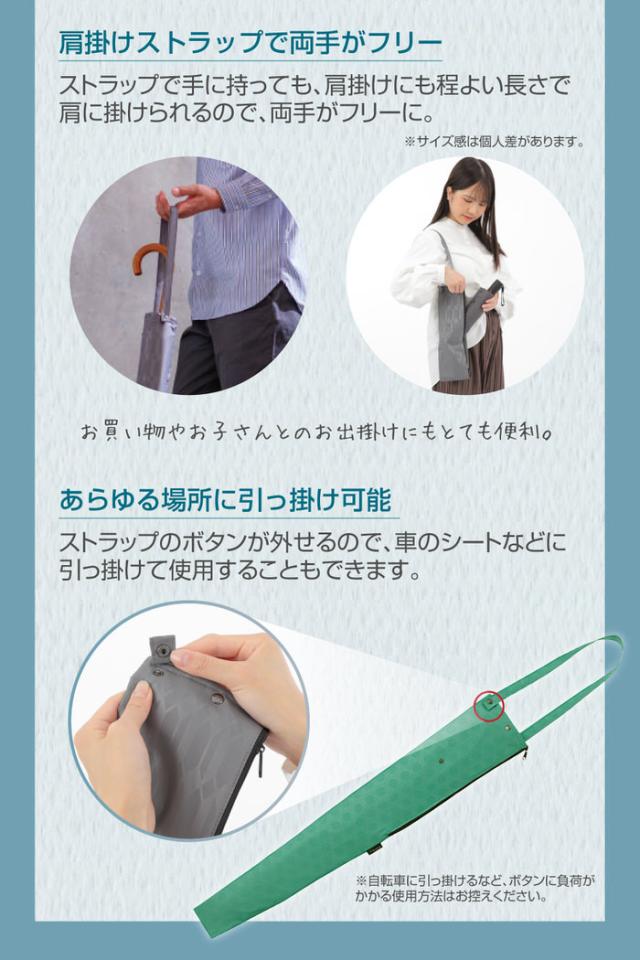 - しっかりした素材で、控えめな柄も入っていて品のあるおしゃれな傘入れ。スナップで長さを調整出来るので、長傘も折りたたみ傘も収納可能なのも良いです。ファスナー付きで長傘の出し入れも楽に!至れり尽くせりで購入して良かったです!