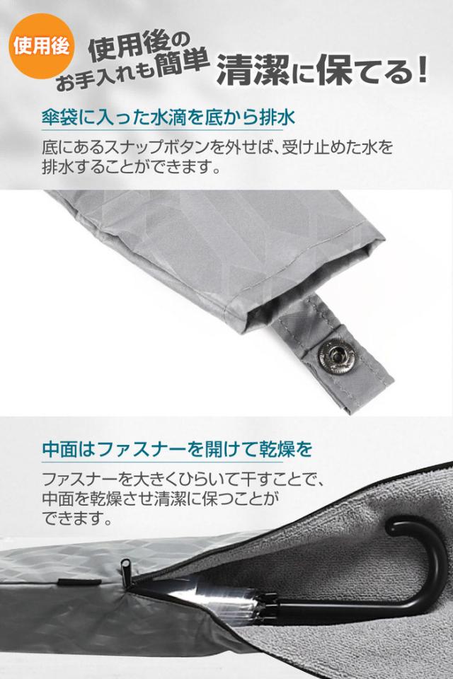 - 購入後まだ雨の日に使用していないので未使用時の感想になります。(使ってから感想書こうと思ったら随分日にちが経ってしまいました…) 生地がとてもしっかりしているので安心して使えそうです。発送があまりに早くて驚きました。迅速な対応ありがとうございました。