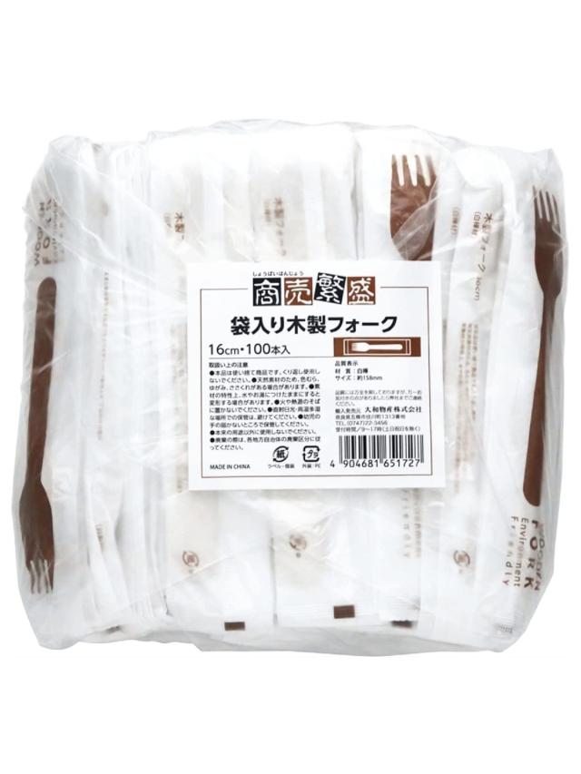 大和物産 使い捨て 木製 フォーク 100本 15.8cm 商売繁盛 個包装で衛生的 環境に優しい
