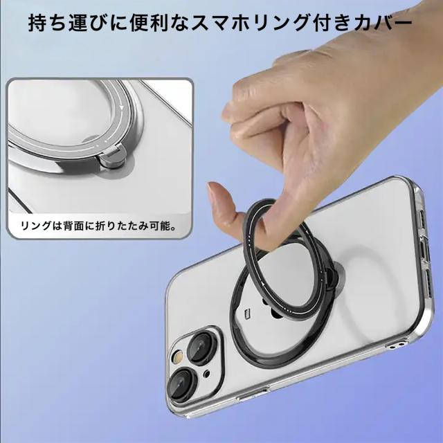 | カメラレンズも保護するスマホリング付きiPhoneTPUカバー iPhoneは女性の手には少し大きくて落として画面が割れるような事もしばしば。。 このiPhoneケースは背面に360度回転するスマホリングが付いているので落下する確立を激減してくれます。またレンズ部分には透明度が高く強度のある9Hガラスが施されておりカバーをはめるだけでレンズまで保護してくれる優れモノです。 そんな携帯に便利なスマホリングはスタンドとしても使用が可能。 リングは回転する仕組みになっているので縦置きや横置きはもちろん微妙な角度に調整が出来るのでyoutube等の動画視聴にも最適です。 またリングはメタル仕様になっておりMagSafe商品を吸着できアップル純正のワイヤレス充電器にもカバーを付けたまま充電をする事が出来ます。 ※スマホリング自体にマグネット機能は付いておりません。対応する機種はiPhone12、13、14、と最新シリーズ15の全モデルに対応しています。 |