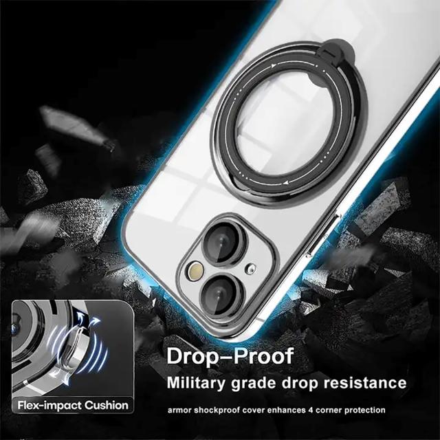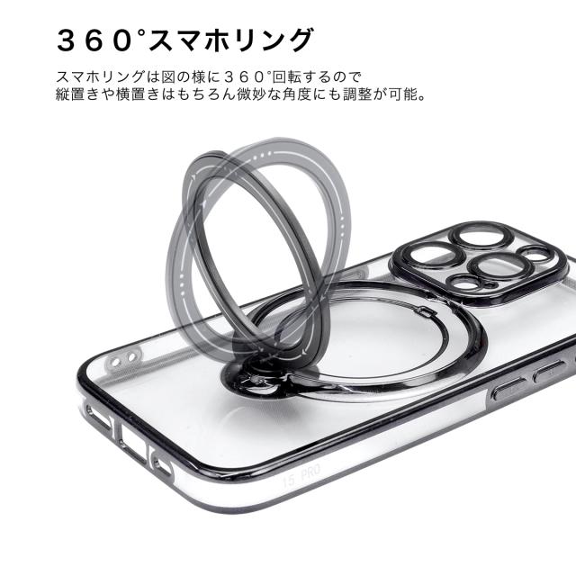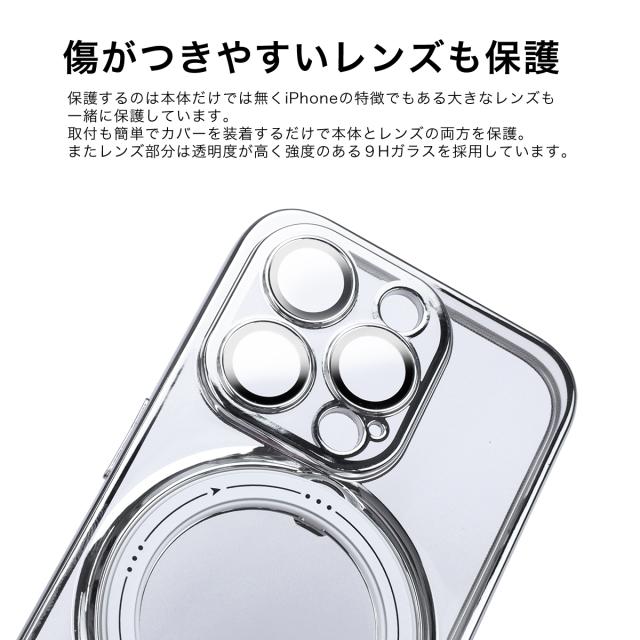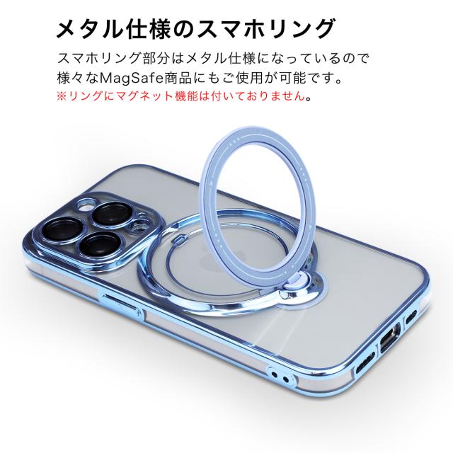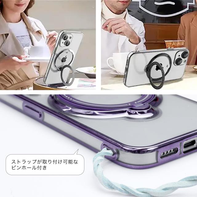 iPhoneは女性の手には少し大きくて落として画面が割れるような事もしばしば。。このiPhoneケースは背面に360度回転するスマホリングが付いているので落下する確立を激減してくれます。またレンズ部分には透明度が高く強度のある9Hガラスが施されておりカバーをはめるだけでレンズまで保護してくれる優れモノです。そんな携帯に便利なスマホリングはスタンドとしても使用が可能。リングは回転する仕組みになっているので縦置きや横置きはもちろん微妙な角度に調整が出来るのでyoutube等の動画視聴にも最適です。またリングはメタル仕様になっておりMagSafe商品を吸着できアップル純正のワイヤレス充電器にもカバーを付けたまま充電をする事が出来ます。※スマホリング自体にマグネット機能は付いておりません。対応する機種はiPhone12、13、14、と最新シリーズ15の全モデルに対応しています。