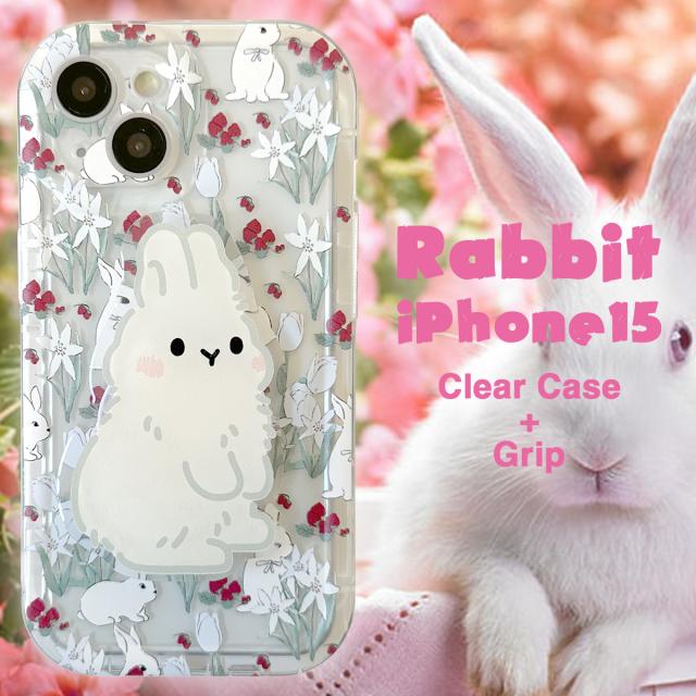 SALE ラビット iPhone15 iPhone14 ケース スマホグリップ付き うさぎ ウサギ バンカーリング スマホリング スマホスタンド アイフォンケース クリア 透明 カバー