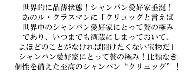 世界的に品薄状態!シャンパン愛好家垂涎! あのル・クラスマンに「クリュッグと言えば 世界中のシャンパン愛好家にとって贅の極み であり、いつまでも酒蔵にしまっておいて、 よほどのことがなければ開けたくない宝物だ」 シャンパン愛好家にとって贅の極み!比類なき 個性を備えた至高のシャンパン“クリュッグ”! ■さまざまなギフトアイテムをご用意しております。お中元 ギフト 御中元 お盆 お礼 敬老の日 クリスマス 冬ギフト お歳暮 御歳暮 お年賀 御年賀 お正月 年末年始 ご挨拶 バレンタイン ホワイトデー お返し 父の日 母の日 ギフト 贈答品 お土産 手土産 御祝 御礼 内祝い 引き出物 お祝い 結婚祝い 結婚内祝い 出産祝い 出産内祝い 引き菓子 快気祝い 快気内祝い 進学祝い 誕生日祝い バースデーケーキ プレゼント Wedding ウェディング ホームパーティ お花見 パーティ 退職ギフト 退職 就任祝い0103004014049