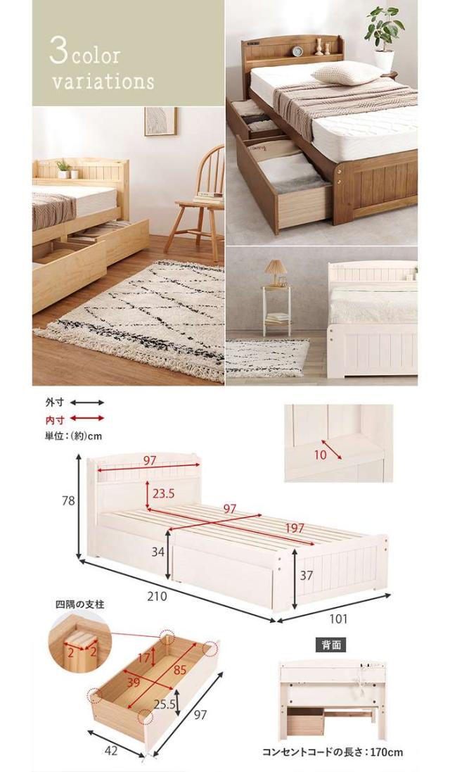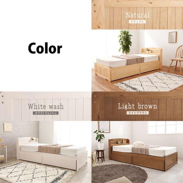 引出し付シングルベッド。カラーは、ライトブラウン(4934257308762:MB-5039S-LBR)、ナチュラル(4934257308779:MB-5039S-NA)、ホワイトウォッシュ(4934257308786:MB-5039S-WS)、です。大容量引出し収納付きの天然木すのこベッド。小物が置ける宮棚とコンセント付き。