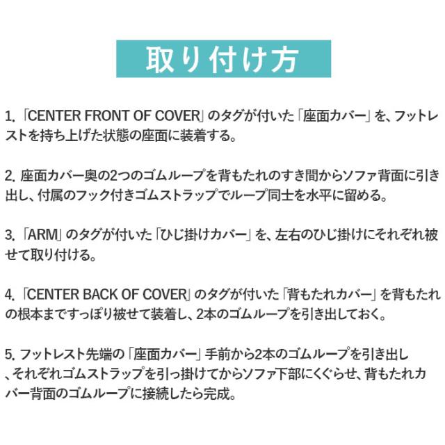 | 注意点 | 【取り付け方は5ステップ!】 1.「CENTER FRONT OF COVER」のタグが付いた「座面カバー」を、フットレストを持ち上げた状態の座面に装着する。 2.座面カバー奥の2つのゴムループを背もたれのすき間からソファ背面に引き出し、付属のフック付きゴムストラップでループ同士を水平に留める。 3.「ARM」のタグが付いた「ひじ掛けカバー」を、左右のひじ掛けにそれぞれ被せて取り付ける。 4.「CENTER BACK OF ご利用シーンやイベントなど:お正月 初売り 初詣 お年玉 成人の日 成人式 節分 バレンタインデー 桃の節句(ひなまつり) ホワイトデー 春物入荷 お花見 入学式 ゴールデンウィーク 母の日 衣替え 父の日 梅雨 夏物入荷 山開き 海開き 七夕 お中元 暑中お見舞い 夏休み 花火大会 盆踊り 夏祭り 秋物入荷 防災 敬老の日 ハロウィン 運動会 文化祭 学園祭 お歳暮 冬物入荷 クリスマス プレゼント 贈物 贈り物 ギフト お返し 引っ越し祝い 新生活 お祝い 内祝い 出産祝い 引っ越し祝い 引越し祝い 引越祝い 新築祝い 成人祝い 卒業祝い 就職祝い 合格祝い 入園祝い 入学祝い 進学祝い 結婚祝い 婚約祝い 退院祝い ボーナス祝い 七五三祝い 退職祝い 還暦祝い 長寿祝い 誕生日 お誕生日 大掃除 レビュー商品の評価: お店の情報お店の評価: 連絡・応対 - 配送スピード - 梱包 - |