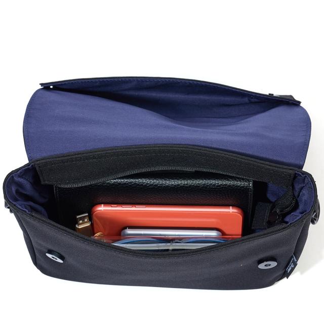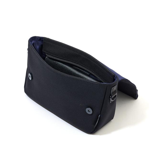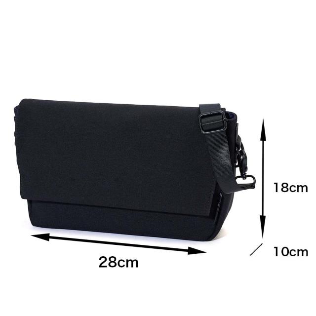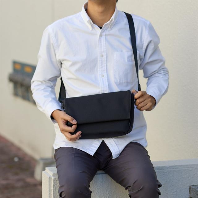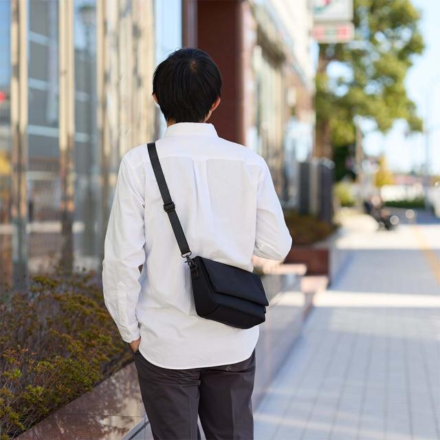ミニマルフェイスなショルダーバッグです。シンプルな作りですが簡単なバッグで終わらないように微妙なシルエット調整にこだわりました。500mlペットボトルとロングウォレットが入るサイズです。メイン入り口はファスナーで開け閉めできます。