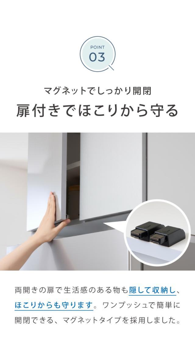 プッシュオープン式の扉付きでホコリの侵入を防ぎ取り出す時はサッと開けられます。