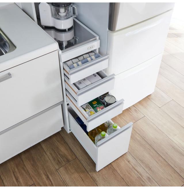 中天板には水や熱に強いステンレス鋼を使用。前面にはツヤあり、水や汚れに強いポリエステル化粧板を使用、本体には特殊コートを施しており、しつこい汚れなどサッと拭き取れます。引出しは1〜3段目にはカトラリーなど小物の収納に便利です。最下段はスライドレール付きで重い物をいれても楽に引き出せて便利です。上部の扉は、組立時に左右どちら開きにも設定できます。