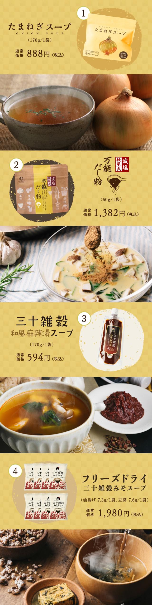 【内容量】たまねぎスープ、万能だし粉、三十雑穀麻辣湯スープ、三十雑穀フリーズドライ味噌汁