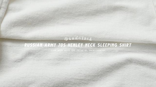 デッドストックのロシア軍スリーピングシャツです。未使用品ですが、長期保管時に生じた汚れや日焼けなどがある「コンディションB」になります。 ご自身で後染めを楽しんでいただく事もできますし、ホワイトなので漂白剤に浸してブリーチしても良いと思います。(自己責任でお願いいたします。)スリーピングシャツの中でも人気の高いロシア軍のスリーピングシャツですが、こちらはその中でも年代が古い70年代に使用されていたロシア(旧ソビエト連邦)軍のスリーピングシャツになります。素材から縫製に至るまで、完成度の高さやクラシカルなヘンリーネックが人気の秘密です。