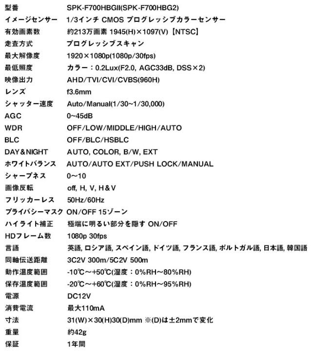 【SALE】SPK-F700HBGII(SPK-F700HBG2) | 213万画素4in1フルHD小型カメラ【防犯カメラ】【 監視カメラ】【アナログハイビジョン】