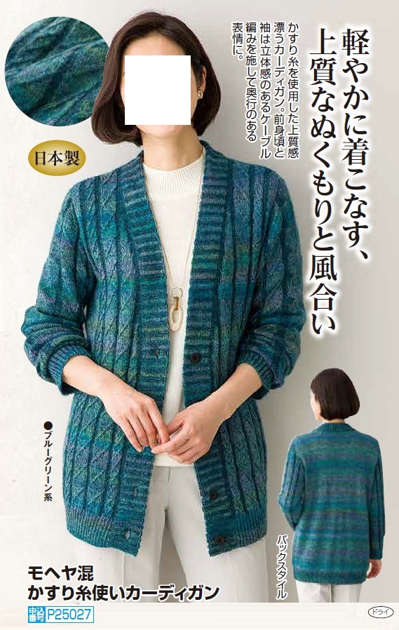 ニットカーディガン カーデ レディース 日本製 モヘヤ混 かすり糸使いカーディガン ブルーグリーン 婦人服 ミセス シニア 女性 ケーブル編み ケーブルニット 上品 シニアファッション 40代 50代 60代 70代 80代 母の日 お母さん おばあちゃん 秋物 冬物 秋冬 fuji p25027