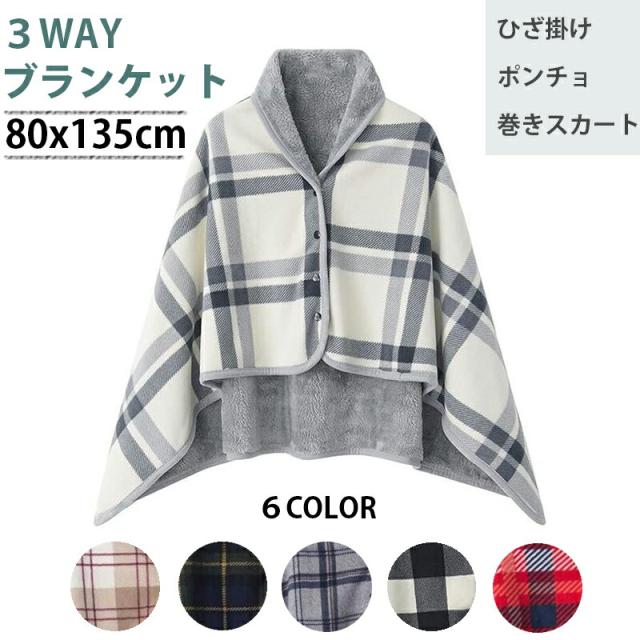 3WAYブランケット 80x135cm 大判 ポンチョ ひざ掛け 巻きスカート 北欧風 チェック柄 フリース KAN001123