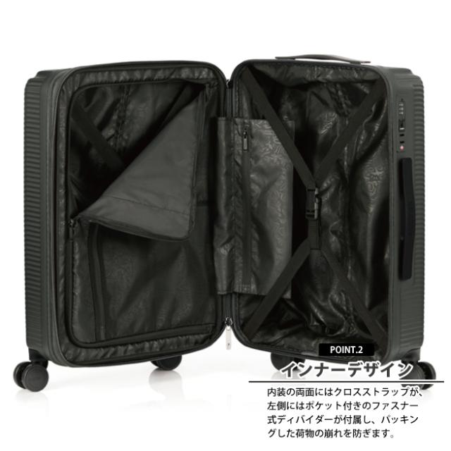360°デザインボディ/同色ホイールキャップ/クロスストラップ+ファスナーディバイダー/TSAロック/軽量設計/3年保証(条件付き)