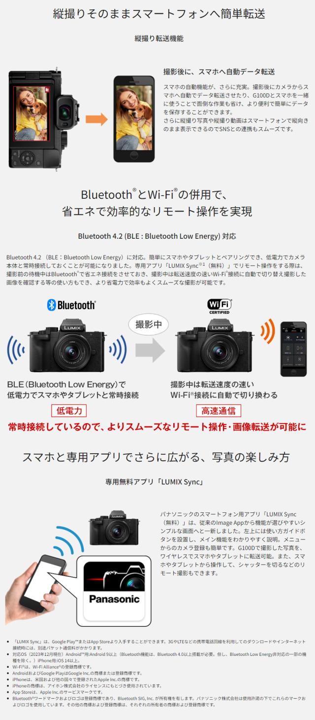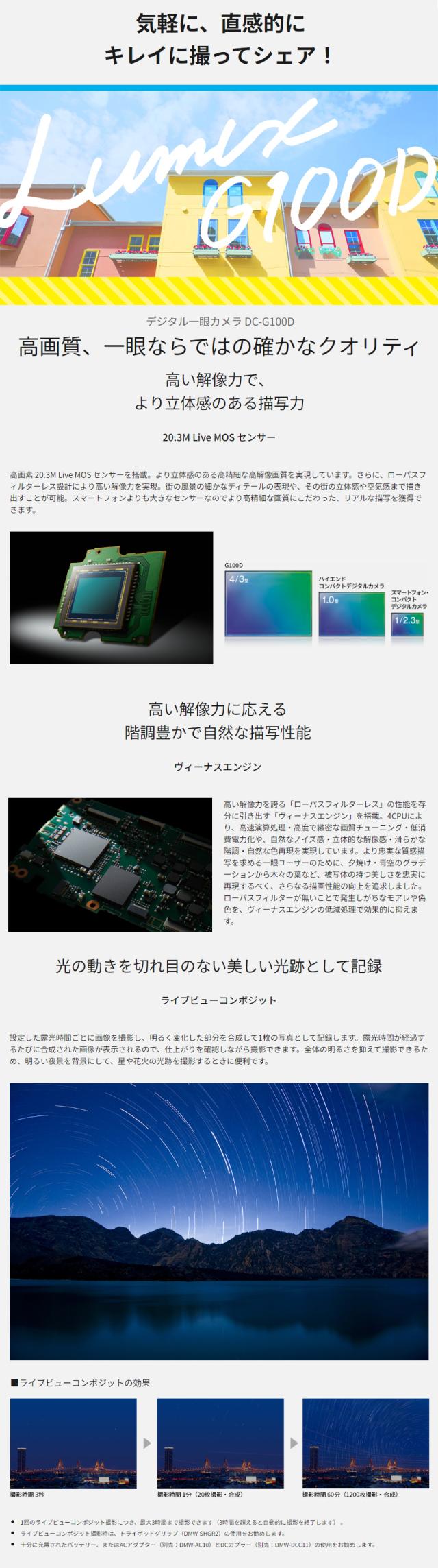 | DC-G100DV-K(ブラック) LUMIX Vキット (標準ズームレンズ、トライポッドグリップ付属)ルミックス スペック情報 | |
