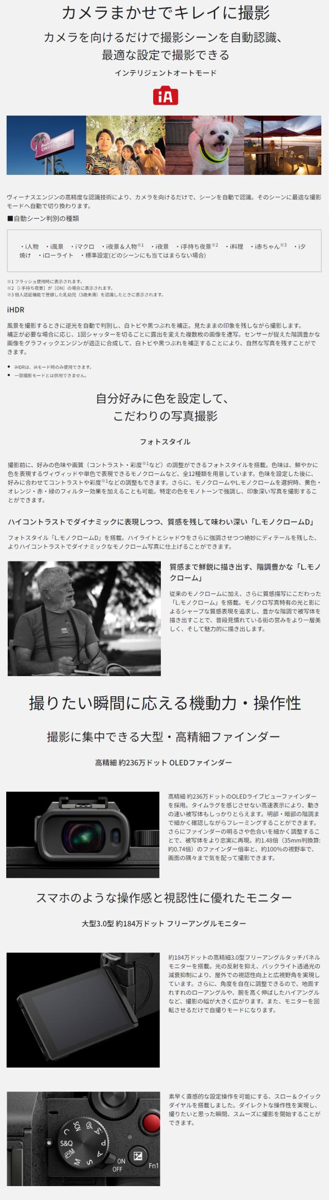 ・iAモード、クリエイティブコントロール、フォトスタイル、アプリ連携でスマートフォンに転送など手軽に一眼カメラを楽しめる