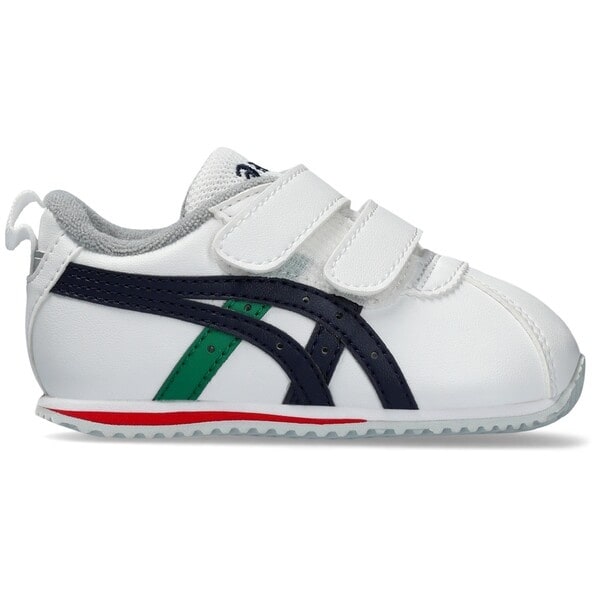 約1歳から3歳の幼児向けに展開する「BABY」シリーズのローカットシューズ。かかとの安定性を重視し、かかとを包み込む立体的な中敷を採用しています。扇形のつま先部分は足ゆびをのびのびと動かすことができ、踏ん張りやすいのが特徴。インナーソールの素材には抗菌・消臭効果のあるシャインアップと、汗をすばやく吸収、拡散してドライ感を保つウォーターマジックを採用。靴の中を快適に保ちます。フィット感の調節がしやすい2本ベルトで、アッパーにはお手入れしやすい人工皮革を使用。大人っぽさを意識した、ユニセックスなカラーのアシックスストライプを配置し、ウエアとのコーディネートもしやすいアイテムです。