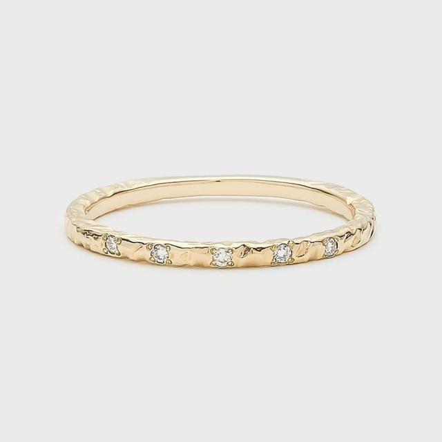 クラフト感のあるテクスチャーとダイヤモンドの煌めきが印象的なリング。ダイヤモンドはリングアームに埋め込むようにセッティングし、極力引っ掛かりのない着け心地の良さにこだわりました。ニュアンスのある表情を持ちながら素肌にすっと溶け込むスキンジュエリーは、どんなスタイルにも合わせやすく、重ね着けにも程よい変化を与えてくれます。※サイズ直しプラスマイナス2号迄。※天然石や天然素材を使用しているものは、サイズ・色味・風合いの違いや、若干の傷、内包物の有無などに個体差があります。予めご了承ください。