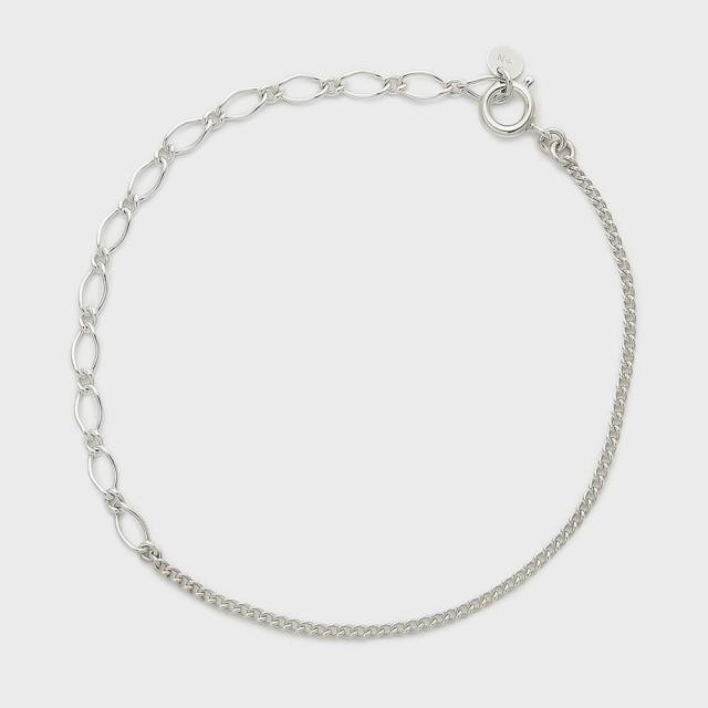 デザインの異なるチェーンを組み合わせたブレスレット。目の粗いチェーン(約8cm)はアジャスターチェーンとして、好きな位置に留め具を付けてサイズ調整ができ、ユニセックスでお使いいただけます。ペアブレスレットとしてもおすすめ。※天然石や天然素材を使用しているものは、サイズ・色味・風合いの違いや、若干の傷、内包物の有無などに個体差があります。予めご了承ください。