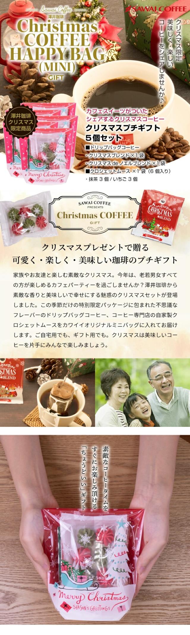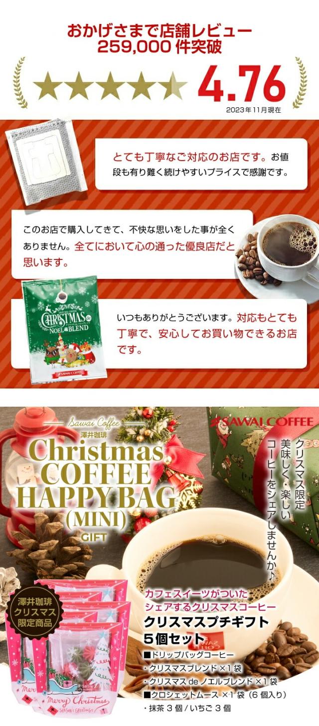 澤井珈琲 クリスマス限定ハッピーバッグギフト ミニサイズ まとめ買い5個セット ※冷凍便同梱不可 コーヒー ドリップコーヒー ドリップ ドリップパック ドリップバッグ クリスマス ギフト プレゼント プチギフト コーヒーギフト スイーツ付き 珈琲 個包装 8g お菓子