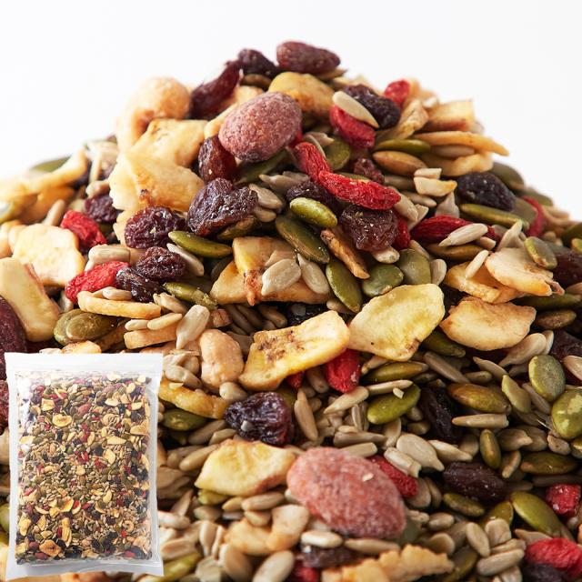・原材料名:ひまわりの種、かぼちゃの種、レーズン、バナナ、カシューナッツ、アーモンド、くこの実、すいかの種、砂糖、植物油、食塩、香料