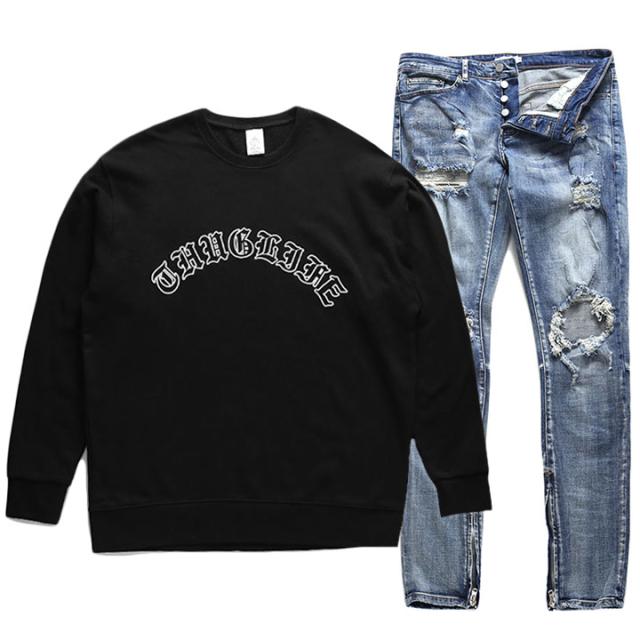 (上)が「THUG LIFE」をLAtimes風の伝統的なオールド文字でドロップしたトレーナー、(下)がシンプルなスリムジーンズの上下セット。