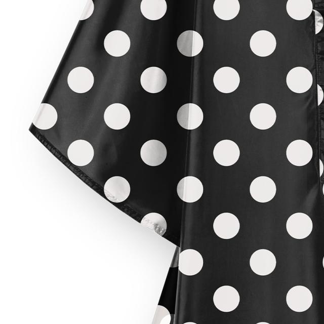 急な雨でもさっとかぶってカラダやバッグを守る撥水加工のポンチョです。リサイクルペットボトルから作られた丈夫なポリエステル生地を使用していて、環境にも優しいアイテムです。おしゃれなドット柄のレインコートで差別化できます。