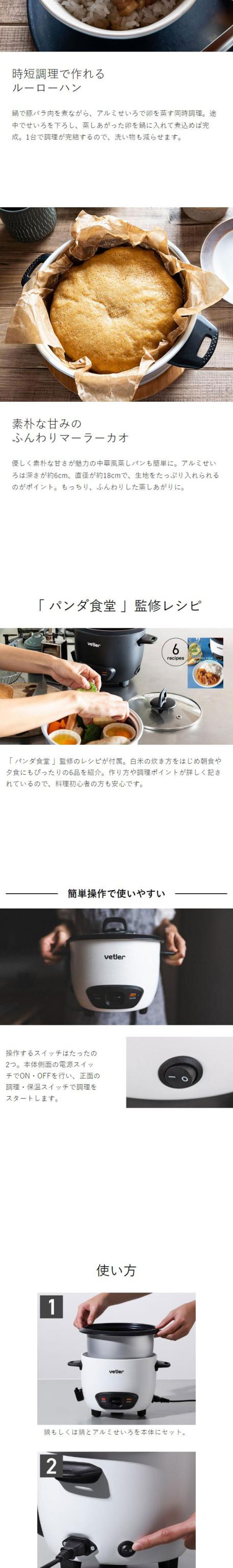スイッチONで簡単に使える電気鍋『 VETLER イージークッカー ボルトン 』。1台で煮る・炊く・蒸す・保温の4つの調理ができます。煮物や鍋料理、4合までの炊飯ができて、鍋と付属の蒸し器を組み合わせれば、上下の同時調理もOK。うまみを閉じ込めたヘルシーな蒸し料理も、煮込み料理と一緒に作れます。1〜2人分の調理に適したコンパクトサイズで、一人暮らしの方の炊飯器や、サブの調理鍋としてもおすすめ。昭和家電を思わせるレトロデザインも魅力です。