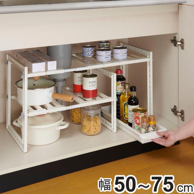 シンク下ラック トレー付き シンク下フリーラック 伸縮タイプ ( 伸縮 シンク下 シンク下収納 キッチン収納 洗面台下 収納棚 キッチン 洗面所 収納 流し台下 コンロ下 幅伸縮 ラック 棚 可動棚 フリーラック 整理棚 収納ラック )