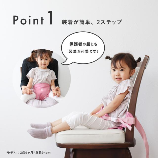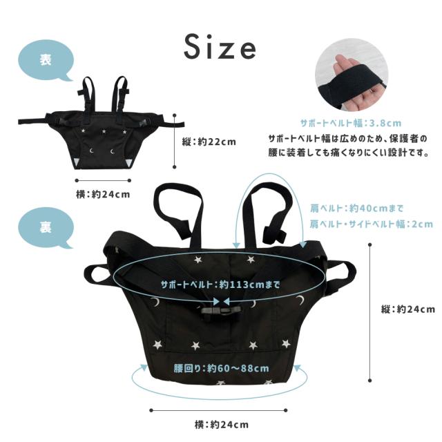 サポートベルト幅は広めのため、保護者の腰に装着しても痛くなりにくい設計です。