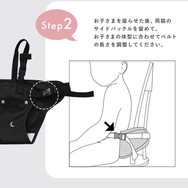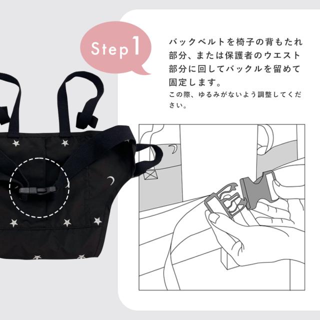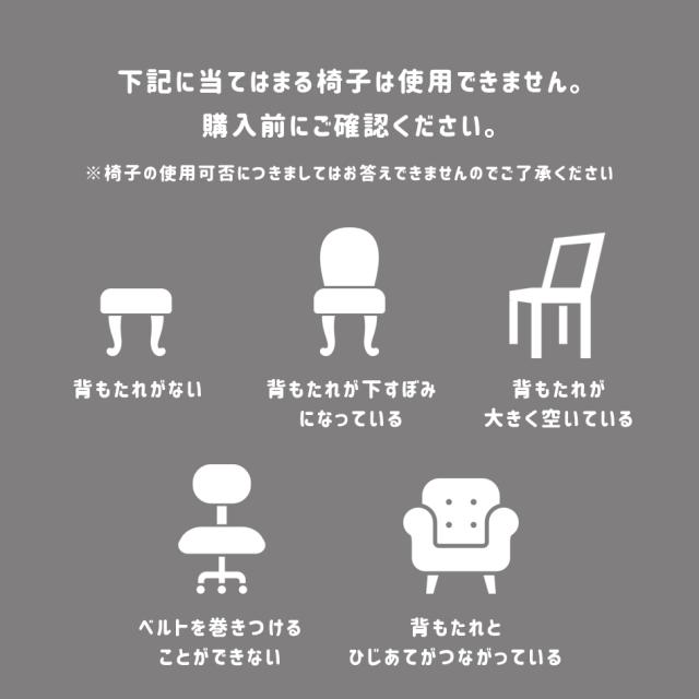 1.バックベルトを椅子の背もたれ部分(または保護者のウエスト部分)に回して