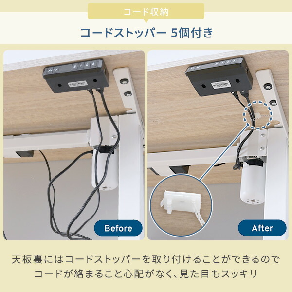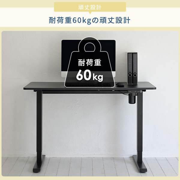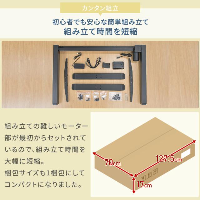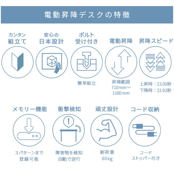 | 商品説明 | ●ボタン1つで高さを自由にセットできる上下昇降デスク ●高さは3パターンまでメモリー登録可能 ●衝撃検知センサー搭載 ●安定感のあるしっかりした脚部フレーム ●ガタつきを抑えるアジャスター付き ●天板厚さ:1.8cm ●耐荷重:60kg(均等荷重) ●消費電力:72W(USB未接続時) ●USB急速充電可能 ●USBタイプA 1口、USBタイプC 1口付き ●USBソケットの定格消費電力:18W ●昇降スピード <荷重なし>上昇23.0秒 下降22.92秒 <60kg荷重>上昇23.73秒 下降22.01秒 【重要】組み立てについて 大型で重量もございますのでお二人以上での搬入、組み立てをお願いいたします。また、プラスドライバーをご用意お願いいたします。 |