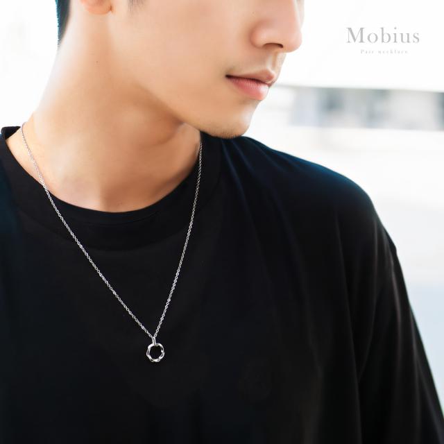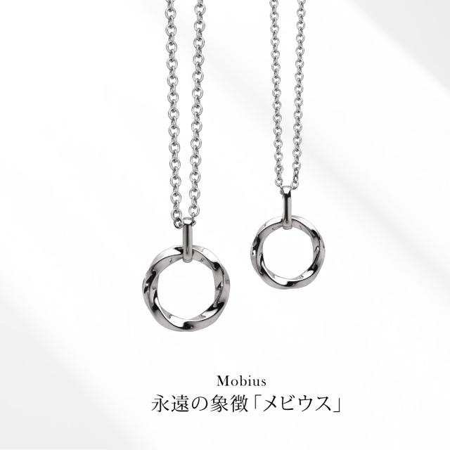 メビウスの輪をモチーフにしたペアネックレスです。表と裏をつなぎ、もと居る場所へと戻る「メビウスの輪」は、永遠を象徴する形で、永遠の愛や、結ばれた運命を表現しています。メンズもレディースも着けやすい小さなサイズ感でカジュアルな服装やシンプルスタイルにピッタリのアイテム。トップ部分はシルバー925(銀製)で作られ、肌に触れるチェーン部分は金属アレルギーの心配が少ないステンレス製のチェーンを使用。上質なシルバー925をジュエリーコーティングしているので、変色しにくく、アレルギーの心配も少なく使いやすい仕様です。※ペアセット売りです。男性用は50cm+5cm、女性用は45cm+5cmのチェーンが付属します。