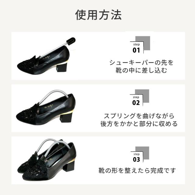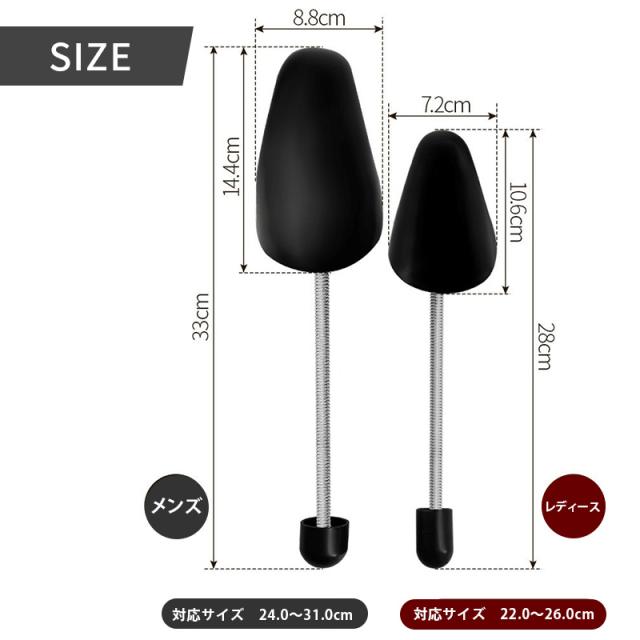| 商品説明 | スプリング式のシューキーパーです。 靴の型崩れを防いで、長持ちさせてくれるケア用品です。 スプリング式なので、シューズの形状に自然にフィットします。 革靴からスニーカーまで幅広くお使い頂けます。 メンズ用とレディース用の2サイズ、ブラックとクリアの2カラーからお選び頂けます。 |