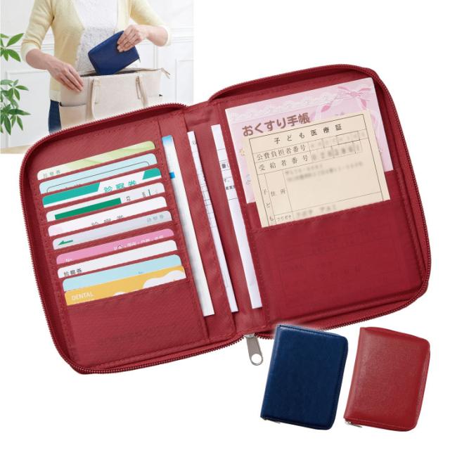 診察券など病院関係の小物をまとめて収納できるケース。高級感のあるレザー調。持ち運びに便利なコンパクトサイズ。カードが落ちにくいファスナータイプ。お薬手帳、診察券、保険証、処方箋など通院時の物忘れ防止に。