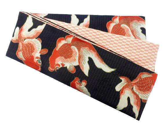 半幅帯 半巾帯 リバーシブル ブランド おりびと 織美桐 桐生織 帯 細帯 黒地 金魚 着物 カジュアル レディース アレンジ 四寸 日本製 女性 和装 和服 レトロ モダン 送料無料No.210