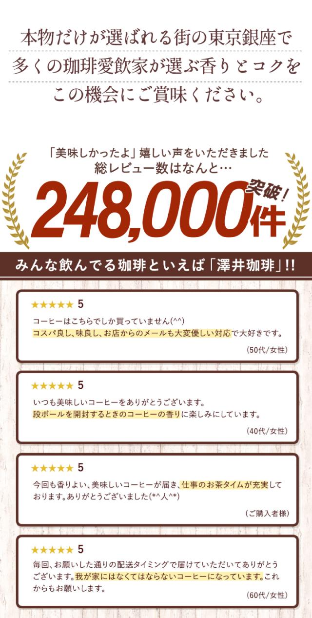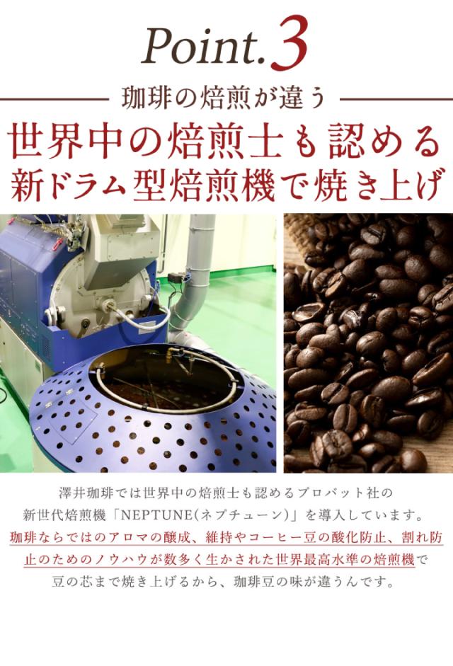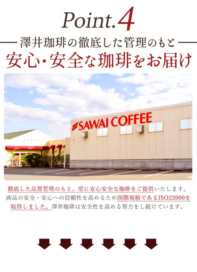 澤井珈琲(さわいこーひー)では、お客様のお家に商品が届き、箱を開けた瞬間。そして、トレードマークの赤いコーヒー袋の封を開けた時に鮮度抜群の「香り高さ」と、飲んだときの「味わい」に感動して頂けるように、レギュラーコーヒーはご注文を頂いてから焙煎をして焼きたてのコーヒー、コーヒー豆、珈琲、珈琲豆をお届けをしている焼き立て珈琲専門店です。お客様に「美味しい」と言って喜んで頂く事が私たちの喜びと思ってます。「美味しいコーヒーをお届けしたい」と想い続けて生まれたこだわりの味を、どうぞ、この機会にお楽しみくださいませ。澤井珈琲では、コーヒー豆は挽き方がご選択いただけます。珈琲豆を挽く事をお楽しみ頂ける『豆のまま』や、私共の専用の特注サイズの大型のミルで挽いて、コーヒー粉の状態にしてお届けする方法がございます。中挽き、細挽き、粗挽き、荒挽きなど様々な挽き方がございますが、私共がお薦めする『店長のおすすめ挽き』にて、そのコーヒーに合った一番美味しいと思える挽き方に挽いてお届けします。東京の銀座にも実店舗を構え、都内では浅草やスカイツリーのあるソラマチにも出店。「鳥取のコーヒー屋さん」とも呼ばれてますが、空気が綺麗で自然豊かな鳥取県に焙煎工場を構え、隣接する島根県の松江市や出雲市にも実店舗がございます。顔の見えないネット通販ですが、全国11店舗を展開する安心安全な澤井珈琲は、特徴的な「赤いコーヒー袋」に入れて、全国の珈琲好きにお選び頂いてます。よく間違えられる名前として、沢井珈琲、沢井コーヒー、澤井珈琲店、澤井珈琲本店、さわいこーひー、サワイコーヒーなどがございますが、正式名称は澤井珈琲となります。