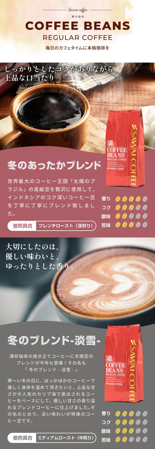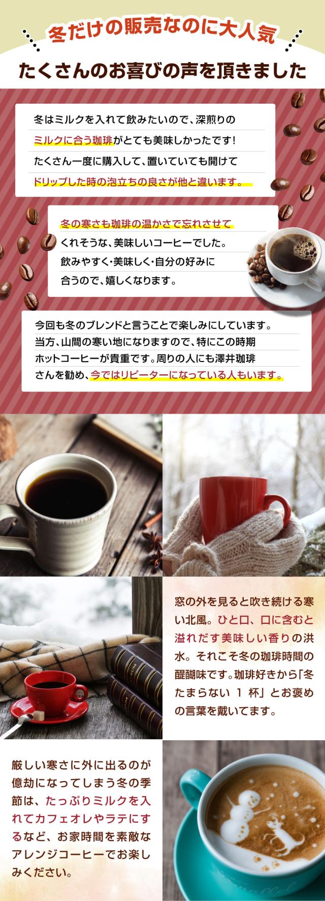 | 産地 | 【冬のあったかブレンド】インドネシア、ブラジル 【冬のブレンド-淡雪-】ブラジル、メキシコ、他 【ウィンターブレンド】ブラジル、エチオピア他 |