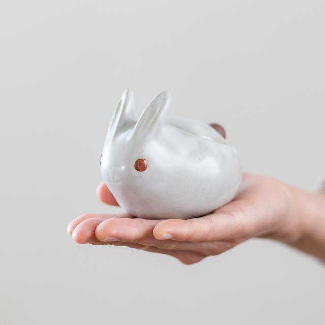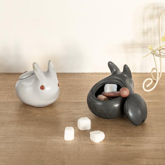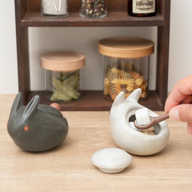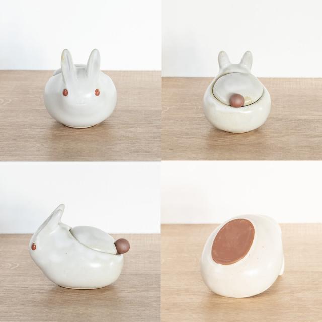 小さなスプーンが付いたうさぎポットは、常備のふりかけやシュガー入れなどに使えます。こんなテーブルアクセサリーなら、いつもの食卓を楽しく豊かなものにしてくれそうです。