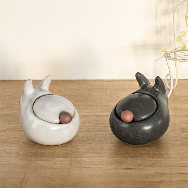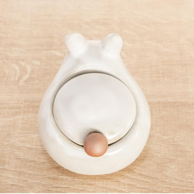 しっぽに見立てた陶器製のスプーン付きです。しっぽを持ち上げると背中の蓋が浮いて開けやすくなります。