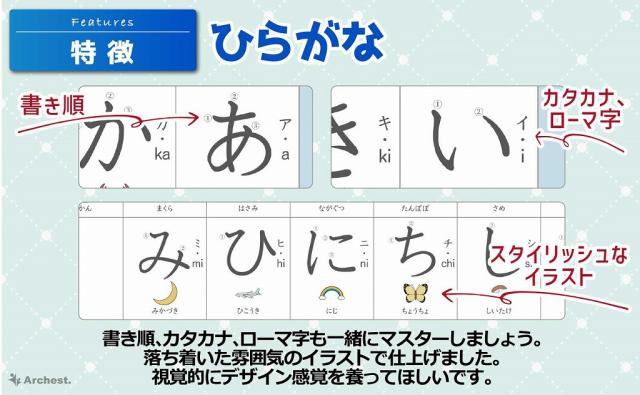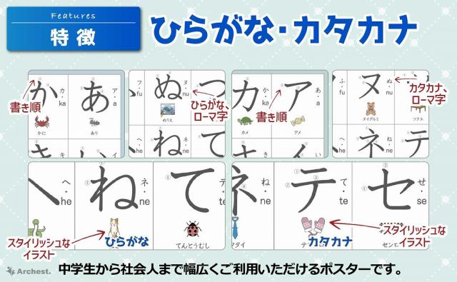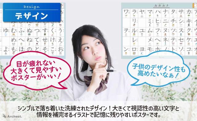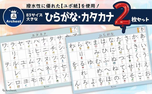 ひらがなとカタカナの2枚セットです。イラスト付きで情報が記憶しやすくなります。とくに新しい知識を学習するときは、イラストが記憶の補助となって効果的な学習を促進します。