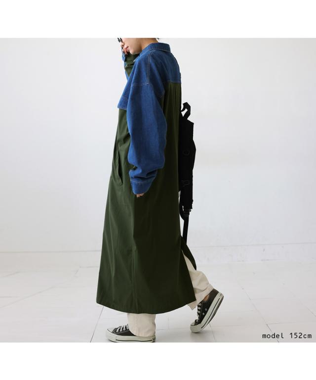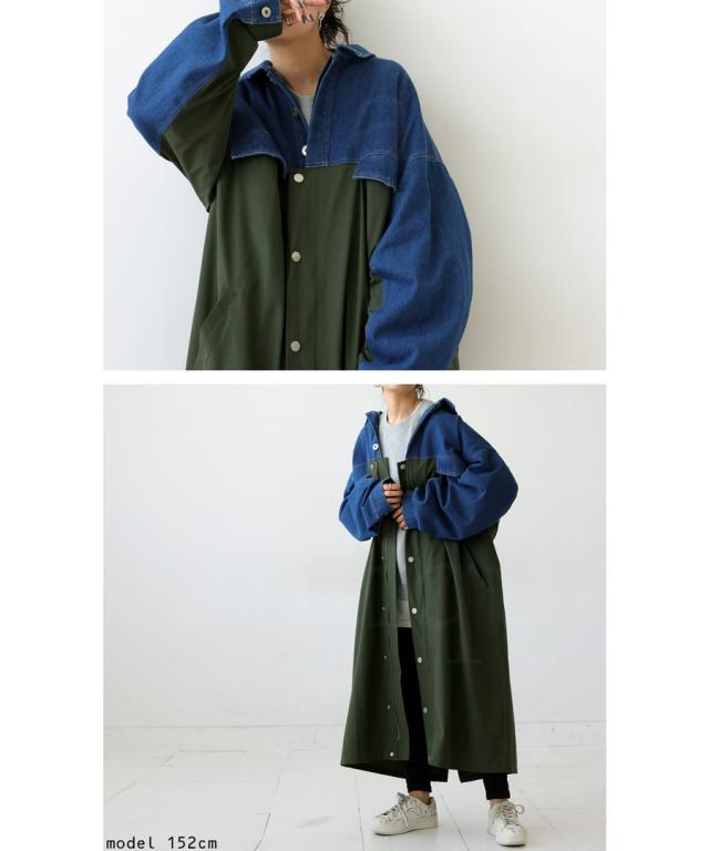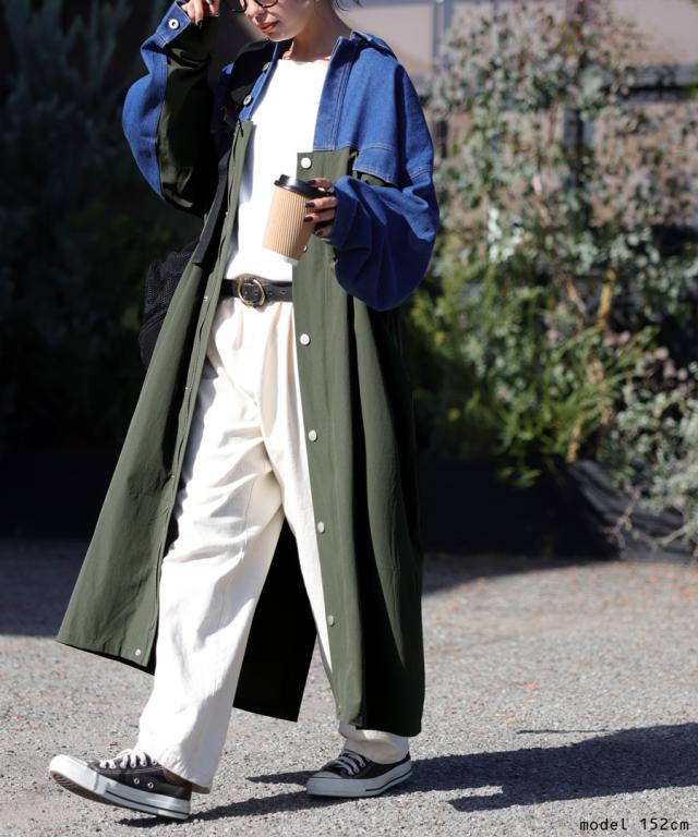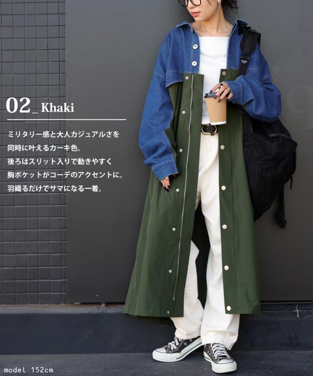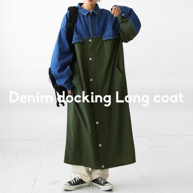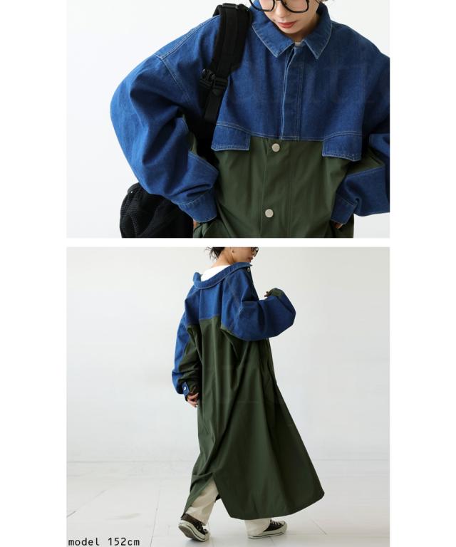 zk-00128 ロング デニム 布帛 切り替え 異素材 ドッキング 羽織り シンプル 高級感 上品 配色 ロングコート レギュラーカラー ロングジャケット 胸ポケット 大きめ 大きいサイズ