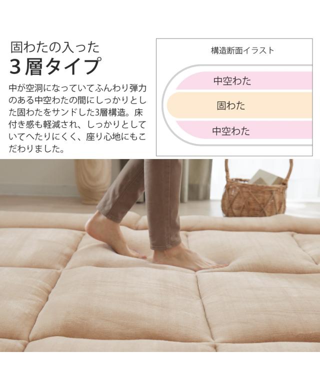 品質:表面=ポリエステル100%、中材=ポリエステル100%(固わた入り)、裏面=ポリエステル100%(滑りにくい加工付) ※商品は圧縮した状態でお届けします。<お手入れ方法> カーペットクリーナー、または、家庭用中性洗剤を希釈して汚れを拭き取るようにしてください。 原産国:中国製 洗濯表示:洗濯不可