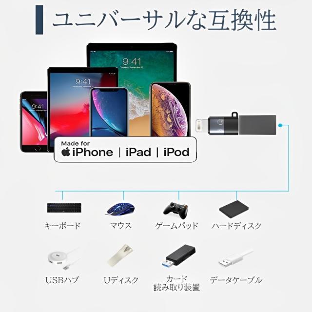 iOS 9.2以降対応。対応:MIDIキーボード、電子ピアノ、SD/microSD用のカードリーダー、ドラム、オーディオインターフェース、調音器、USBメモリ、USBキー、モバイルハードディスク、マウス、Wifi、ゲームコントローラ、スキャンガン、プリンター、プロジェクター、レーザーチェックペン、マイクなどの設備を対応できます。