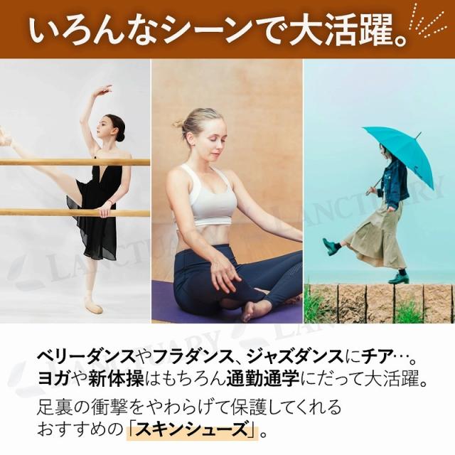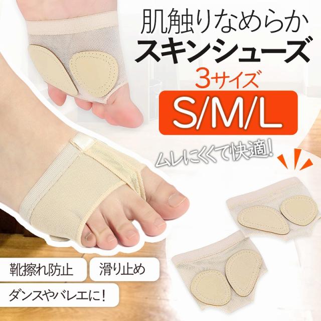 | 商品の説明 | 履くだけ簡単「スキンシューズ 足裏に高品質パッドがあるので、着地の衝撃だけでなく 地面や靴の擦れからも守ってくれます。 足や爪の負担にならないから、バレエやダンスにもぴったり。 パンプスはもちろんスニーカーやブーツの中でもしっかりムレずに長時間使えます。 靴擦れしやすいサンダルやミュールなどにもおすすめ。 肌色だから目立ちにくく、足をしっかり快適に守ってくれます◎ ヒールのある靴だと滑ってつま先が痛い…。 そんなときでも大丈夫。 しっかりと滑り止めとしてフィット感をアップさせてくれます。 まだ買ったばかりで、革靴が足に合わない…。 そんなときも「靴擦れや外反母趾を予防」 してくれるので、ビジネスシーンにも大活躍! ベリーダンスやフラダンス、ジャズダンスにチア…。 ヨガや新体操はもちろん通勤通学にだって大活躍! |