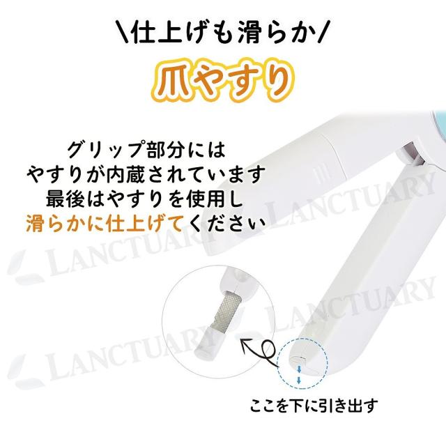 グリップ部分には爪やすりが内蔵されています。下に引き出すだけで簡単に出し入れ可能。最後は爪やすりを使用し滑らかに仕上げてください。